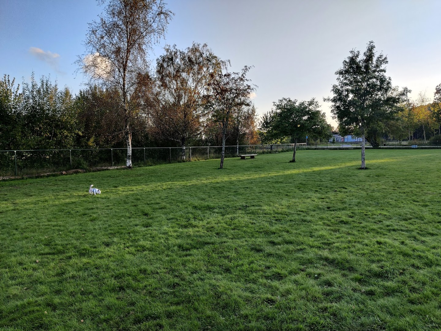 Stor öppen yta för hunden att springa runt på. Extra plus för hållaren med bajspåsar om man råkat glömma.